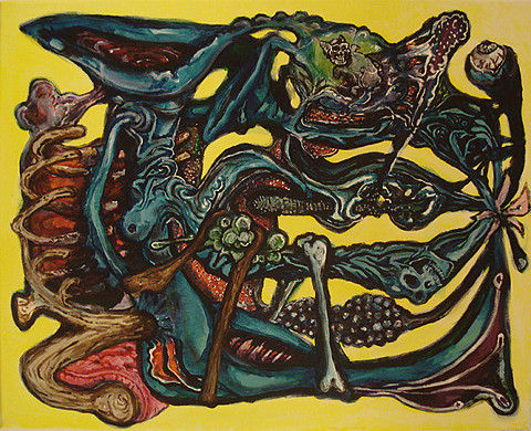 Michel van der Voort (1978) schildert taferelen waarin de mens centraal staat in een geheel eigen, zeer authentieke stijl, die raakt aan graffiti en strip. De schepsels hebben een doorgaans monstrueus en pijnlijk direct voorkomen, zowel in vorm als in expressie.